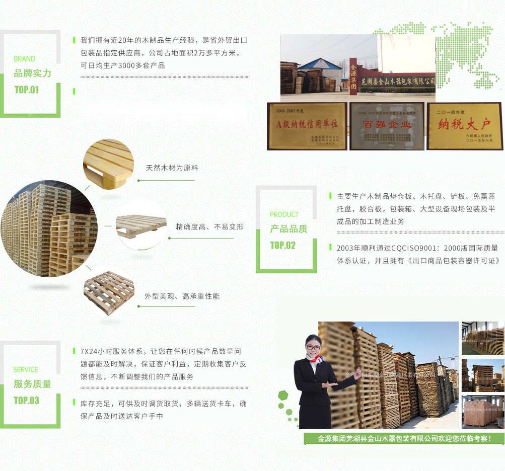 金源集團蕪湖金山木器包裝有限公司是省外貿(mào)出口包裝品指定的供應商,主要生產(chǎn)木制品墊倉板、木托盤、鏟板、免薰蒸托盤,膠合板,包裝箱、大型設(shè)備現(xiàn)場包裝及半成品的加工制造業(yè)務(wù)。產(chǎn)品廣泛用于物流,倉儲,港口,碼頭,機械,建材,化工,紡織,食品,超市,五金電器等行業(yè)。公司占地面積2萬多平方米,注冊資金壹佰壹拾捌萬圓整,公司擁有員工160多人,其中技術(shù)人員占25%,可日均生產(chǎn)3000多套產(chǎn)品,年產(chǎn)值6000多萬元,公司下轄木材加工廠,組裝廠,并備有大型標準烘房,多功能平板刨,壓刨,挖槽,機械設(shè)備等。產(chǎn)品主要銷往國內(nèi)大中型城市并隨貨通行出口國外。